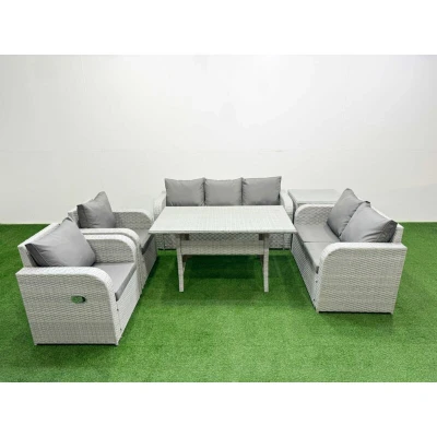 General description This deluxe 6-piece rattan sofa set is an excellent addition to your patio or garden, crafted from high-quality PE rattan and durable galvanized steel. The set includes reclining chairs, a love seat, a 3-seater sofa, a side table, and a dining table, all designed for comfort and style. Technical specifications 2 x Reclining chairs: 74W x 69D x 79H cm 1 x Love Sofa: 124W x 67D x 79H cm 1 x 3 Seater Sofa: 177W x 67D x 79H cm 1 x Side table: 65L x 65W x 66H cm 1 x Dining Table: 140L x 80W x 68H cm Sofa Weight Capacity: 250kg Table Weight Capacity: 80kg Color: Light grey rattan with dark grey fabric Installation Items come flat packed and are easy to assemble. Includes sturdy galvanized steel tube metal frames with powder coating to prevent rust. Usage The 2 armchairs are adjustable, allowing you to change the inclination of the chair back from 90° to 130°. Low maintenance with removable cushion covers. Recommended to keep cushions indoors or use a rain cover when not