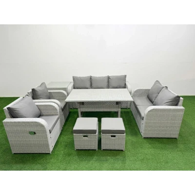 General description This deluxe PE rattan sofa set is an excellent addition to your patio or garden, crafted from high-quality PE rattan and durable galvanized steel. The set includes reclining chairs, a love seat, a dining table, stools, and a side table, all designed for comfort and style. Technical specifications 2 x Reclining chairs: 74W x 69D x 79H cm 1 x Love Sofa: 124W x 67D x 79H cm 1 x 3 Seater Sofa: 177W x 67D x 79H cm 2 x Fully Assembled Stools: 40W x 40D x 34H cm 1 x Side table: 65L x 65W x 66H cm 1 x Dining Table: 140L x 80W x 68H cm Sofa Weight Capacity: 250kg Table Weight Capacity: 80kg Color: Light grey rattan with dark grey fabric Installation Items come flat packed and are easy to assemble. The set features sturdy galvanized steel tube metal frames with powder coating to prevent rust. Usage The two armchairs are adjustable, allowing you to change the inclination of the chair back from 90° to 130° using a button. The ergonomic high back and reclining design provide