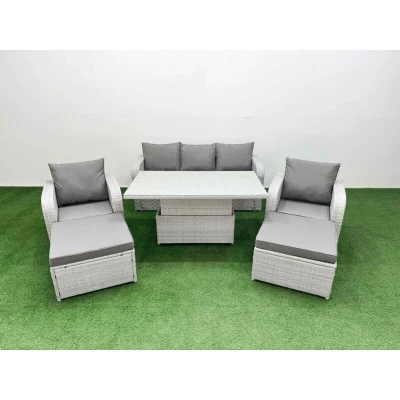 General description This deluxe PE rattan sofa set is a great addition to your patio or garden, made of high-quality PE rattan and durable galvanized steel. The set includes two reclining chairs, a three-seater sofa, two big footstools, and a lifting table, all designed for comfort and style. Technical specifications Reclining chairs size: 74W x 69D x 79H cm Three-seater sofa size: 177W x 67D x 79H cm Big footstools size: 65L x 65W x 34H cm Lifting table size: 140L x 80W x 68/48H cm (height adjustable from 68 cm to 48 cm) Sofa weight capacity: 250 kg Table weight capacity: 80 kg Color: Light grey rattan with dark grey fabric Installation Items come flat packed and are easy to assemble. Usage Adjustable reclining chairs with an inclination range of 90°-130°. Low maintenance with removable cushion covers. Recommended to keep cushions indoors or use a rain cover when not in use. Other information 5mm thick transparent tempered glass with suckers on the surface to prevent sliding. 8 cm