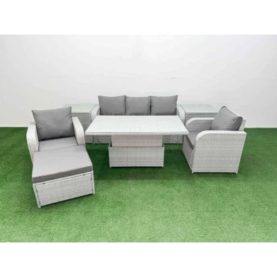 General description This deluxe PE rattan sofa set is a great addition to your patio or garden, made of high-quality PE rattan and durable galvanized steel. The set includes two reclining chairs, a three-seater sofa, a big footstool, two side tables, and a lifting table, all designed for comfort and style. Technical specifications Reclining chairs: 74W x 69D x 79H cm 3 Seater Sofa: 177W x 67D x 79H cm Big footstool: 65L x 65W x 34H cm Side tables: 65L x 65W x 66H cm Lifting Table: 140L x 80W x 68/48H cm (height adjustable) Sofa Weight Capacity: 250kg Table Weight Capacity: 80kg Color: Light grey rattan with dark grey fabric Installation Items come flat packed and are easy to assemble. Sturdy galvanized steel tube metal frames with powder coating to prevent rust. Usage Adjustable reclining chairs with a back inclination range of 90°-130°. Low maintenance with removable cushion covers. Recommended to keep cushions indoors or use a rain cover when not in use. Other information 5mm thick