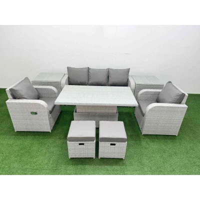 General description This deluxe PE rattan sofa set is a great addition to your patio or garden, made of high-quality PE rattan and durable galvanized steel. The set includes two reclining chairs, a three-seater sofa, two side tables, and two small stools, all designed for comfort and style. Technical specifications Reclining chairs size: 74W x 69D x 79H cm 3-seater sofa size: 177W x 67D x 79H cm Stools size: 40W x 40D x 34H cm Side tables size: 65L x 65W x 66H cm Lifting table size: 140L x 80W x 68/48H cm (height adjustable) Sofa weight capacity: 250 kg Table weight capacity: 80 kg Color: Light grey rattan with dark grey fabric Installation Items come flat packed and are easy to assemble. The set features sturdy galvanized steel tube metal frames with powder coating to prevent rust. Usage The two armchairs are adjustable, allowing you to change the inclination of the chair back from 90° to 130° using a button. The ergonomic high back and reclining design provide extra comfort. The