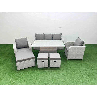 General description This deluxe PE rattan sofa set is a great addition to your patio or garden, made of high-quality PE rattan and durable galvanized steel. The set includes adjustable reclining chairs, a spacious sofa, a lifting table, and stools, all designed for comfort and style. Technical specifications Set dimensions: 2 x Reclining chairs: 74W x 69D x 79H cm 1 x 3 Seater Sofa: 177W x 67D x 79H cm 1 x Big footstool: 65L x 65W x 34H cm 2 x Fully Assembled Stools: 40W x 40D x 34H cm 1 x Lifting Table: 140L x 80W x 68/48H cm (height adjustable from 68 cm to 48 cm) Sofa Weight Capacity: 250 kg Table Weight Capacity: 80 kg Color: Light grey rattan with dark grey fabric Installation Items come flat packed and are easy to assemble. Sturdy galvanized steel tube metal frames with powder coating to prevent rust. Usage Adjustable reclining chairs with an inclination range from 90° to 130°. Low maintenance with removable cushion covers. Recommended to keep cushions indoors or use a rain