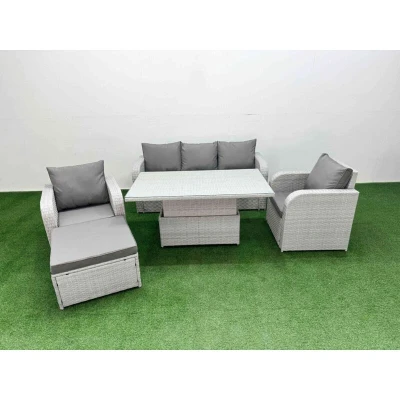 General description This deluxe PE rattan sofa set is an excellent addition to your patio or garden, crafted from high-quality PE rattan and durable galvanized steel. The set includes two reclining chairs, a three-seater sofa, a big footstool, and a lifting table, all designed for comfort and style. Technical specifications Reclining chairs: 74W x 69D x 79H cm 3 Seater Sofa: 177W x 67D x 79H cm Big footstool: 65L x 65W x 34H cm Lifting Table: 140L x 80W x 68/48H cm (height adjustable from 68 cm to 48 cm) Sofa weight capacity: 250 kg Table weight capacity: 80 kg Color: Light grey rattan with dark grey fabric (color may vary due to lighting or monitor settings) Installation Items come flat packed and are easy to assemble. The set features sturdy galvanized steel tube frames with powder coating to prevent rust. Usage The two armchairs are adjustable, allowing you to change the inclination of the chair back from 90° to 130° using a button. The ergonomic high back and reclining design