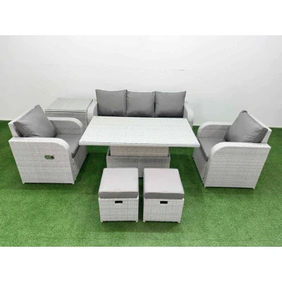 General description This deluxe PE rattan sofa set is a great addition to your patio or garden, made of high-quality PE rattan and durable galvanized steel. The set includes adjustable reclining chairs, a three-seater sofa, a lifting dining or coffee table, a side table, and two small stools, all designed for comfort and style. Technical specifications 2 x Reclining chairs Size: 74W x 69D x 79H cm 1 x 3 Seater Sofa Size: 177W x 67D x 79H cm 2 x Fully Assembled Stools Size: 40W x 40D x 34H cm 1 x Side table Size: 65L x 65W x 66H cm 1 x Lifting Table Size: 140L x 80W x 68/48H cm (height adjustable from 68 cm to 48 cm) Sofa Weight Capacity: 250 kg Table Weight Capacity: 80 kg Color: Light grey rattan with dark grey fabric Installation Items come flat packed and are easy to assemble. Usage Low maintenance with removable cushion covers. Keep cushions indoors or use a rain cover when not in use. Use a rain cover for the furniture if not in use for a long time. Other information 5mm thick