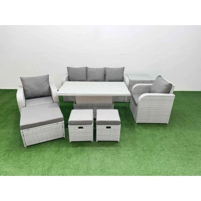 General description This deluxe PE rattan sofa set is a great addition to your patio or garden, made of high-quality PE rattan and durable galvanized steel. The set includes adjustable reclining chairs and a variety of tables, providing both comfort and functionality for outdoor lounging or dining. Technical specifications Set dimensions: 2 x Reclining chairs: 74W x 69D x 79H cm 1 x 3 Seater Sofa: 177W x 67D x 79H cm 1 x Big footstool: 65L x 65W x 34H cm 2 x Fully Assembled Stools: 40W x 40D x 34H cm 1 x Side table: 65L x 65W x 66H cm 1 x Lifting Table: 140L x 80W x 68/48H cm (height adjustable from 68 cm to 48 cm) Sofa weight capacity: 250 kg Table weight capacity: 80 kg Color: Light grey rattan with dark grey fabric Installation Items come flat packed and are easy to assemble. Sturdy galvanized steel tube metal frames with powder coating to prevent rust. Usage Adjustable reclining chairs allow you to change the backrest inclination from 90° to 130°. Low maintenance with removable