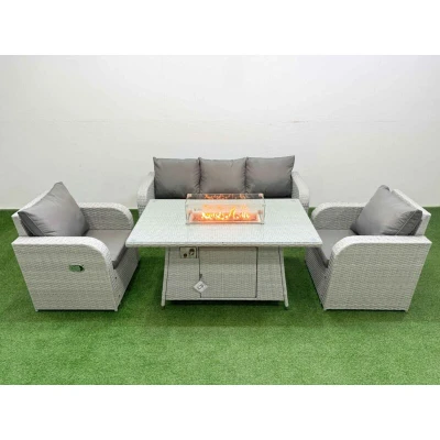 General description This Fimous PE Rattan Garden Furniture Set includes two reclining chairs, a three-seater sofa, and a firepit dining table, all designed for comfort and style. The light grey rattan paired with dark grey fabric creates a modern aesthetic suitable for any outdoor space. The set is easy to assemble and features sturdy galvanized steel tube frames with powder coating to prevent rust. Technical specifications Reclining chairs size: 74W x 69D x 79H cm 3-seater sofa size: 177W x 67D x 79H cm Firepit dining table size: 140L x 80W x 69H cm Sofa weight capacity: 250 kg Table weight capacity: 80 kg Seat cushion thickness: 8 cm Glass thickness: 5 mm (tempered) Installation Items come flat packed and are easy to assemble. Usage Adjustable reclining chairs with an inclination range of 90°-130°. Recommended to use a 5 kg gas tank for the fire pit. Check for gas leaks at joints and hoses before use. Keep cushions indoors or use a rain cover when not in use. Other information