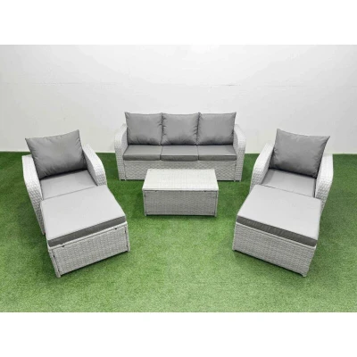 General description This deluxe PE rattan sofa set is a great addition to your patio or garden, made of high-quality PE rattan and durable galvanized steel. The set includes two reclining chairs, a three-seater sofa, two big footstools, and an oblong coffee table, all designed for comfort and style. Technical specifications Reclining chairs: 74W x 69D x 79H cm 3 Seater Sofa: 177W x 67D x 79H cm Big footstools: 65L x 65W x 34H cm Table: 85L x 50W x 37H cm Sofa weight capacity: 250kg Table weight capacity: 80kg Material: PE rattan with galvanized steel frame Cushion thickness: 8 cm Glass thickness: 5 mm tempered glass Installation Items come flat packed and are easy to assemble. Includes sturdy galvanized steel tube metal frames with powder coating to prevent rust. Usage The two armchairs are adjustable, allowing you to change the inclination of the chair back from 90° to 130°. Low maintenance with removable cushion covers. Recommended to keep cushions indoors or use a rain cover when