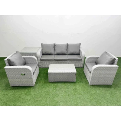General description This deluxe 5 piece rattan sofa set is a great addition to your patio or garden, made of high-quality PE rattan and durable galvanized steel. The set includes two reclining chairs, a three-seater sofa, a side table, and a coffee table, all designed for comfort and style. Technical specifications 2 x Reclining chairs Size: 74W x 69D x 79H cm 1 x 3 Seater Sofa Size: 177W x 67D x 79H cm 1 x Side table Size: 65L x 65W x 66H cm 1 x Coffee table Size: 85L x 50W x 37H cm Sofa Weight Capacity: 250kg Table Weight Capacity: 80kg Color: Light grey rattan with dark grey fabric Installation Items come flat packed and are easy to assemble. Usage The armchairs are adjustable, allowing you to change the backrest inclination from 90° to 130°. Low maintenance with removable cushion covers. Keep cushions indoors or use a rain cover when not in use. Use a rain cover for the furniture if not in use for an extended period. Other information 5mm thick transparent tempered glass with