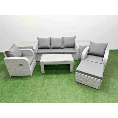 General description This deluxe PE rattan sofa set is an excellent addition to your patio or garden, crafted from high-quality PE rattan and durable galvanized steel. The set includes reclining chairs, a three-seater sofa, a big footstool, a rectangular coffee table, and two side tables, all designed for comfort and style. Technical specifications Reclining chairs: 74W x 69D x 79H cm 3 Seater Sofa: 177W x 67D x 79H cm Big footstool: 65L x 65W x 34H cm Side tables: 65L x 65W x 66H cm (2 units) Table: 105L x 50W x 48H cm Sofa weight capacity: 250kg Table weight capacity: 80kg Color: Light grey rattan with dark grey fabric Installation Items come flat packed and are easy to assemble. Includes sturdy galvanized steel tube metal frames with powder coating to prevent rust. Usage The two armchairs are adjustable, allowing you to change the backrest inclination from 90° to 130°. Low maintenance with removable cushion covers. Recommended to keep cushions indoors or use a rain cover when not in