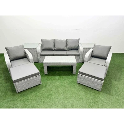 General description This deluxe PE rattan sofa set is a great addition to your patio or garden, made of high-quality PE rattan and durable galvanized steel. The set includes reclining chairs, a three-seater sofa, a rectangular coffee table, two side tables, and two big footstools, all designed for comfort and style. Technical specifications 2 x Reclining chairs Size: 74W x 69D x 79H cm 1 x 3 Seater Sofa Size: 177W x 67D x 79H cm 2 x Big footstool Size: 65L x 65W x 34H cm 2 x Side table Size: 65L x 65W x 66H cm 1 x Table Size: 105L x 50W x 48H cm Sofa Weight Capacity: 250kg Table Weight Capacity: 80kg Color: Light grey rattan with dark grey fabric Installation Items come flat packed and are easy to assemble. Sturdy galvanized steel tube metal frames with powder coating to prevent rust. Usage The two armchairs are adjustable, allowing you to change the backrest inclination from 90° to 130°. Low maintenance with removable cushion covers. Recommended to keep cushions indoors or use a rain