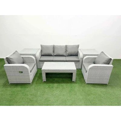 General description This deluxe 6-piece rattan sofa set is a perfect addition to your patio or garden, crafted from high-quality PE rattan and durable galvanized steel. The set includes two reclining chairs, a three-seater sofa, two side tables, and a rectangular coffee table, all designed for comfort and style. Technical specifications 2 x Reclining chairs: 74W x 69D x 79H cm 1 x 3-Seater Sofa: 177W x 67D x 79H cm 2 x Side tables: 65L x 65W x 66H cm 1 x Coffee table: 105L x 50W x 48H cm Sofa weight capacity: 250 kg Table weight capacity: 80 kg Color: Light grey rattan with dark grey fabric Installation Items come flat packed and are easy to assemble. Includes sturdy galvanized steel tube metal frames with powder coating to prevent rust. Usage The two armchairs are adjustable, allowing you to change the backrest inclination from 90° to 130°. Low maintenance with removable cushion covers. Recommended to keep cushions indoors or use a rain cover when not in use. Other information 5mm