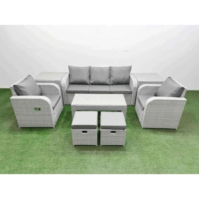 General description This deluxe PE rattan sofa set is a great addition to your patio or garden, made of high-quality PE rattan and durable galvanized steel. The set includes two reclining chairs, a three-seater sofa, two side tables, and two small stools, all designed for comfort and style. Technical specifications 2 x Reclining chairs: 74W x 69D x 79H cm 1 x 3 Seater Sofa: 177W x 67D x 79H cm 2 x Fully Assembled Stools: 40W x 40D x 34H cm 2 x Side tables: 65L x 65W x 66H cm 1 x Coffee Table: 105L x 50W x 48H cm Sofa Weight Capacity: 250kg Table Weight Capacity: 80kg Color: Light grey rattan with dark grey fabric Installation Items come flat packed and are easy to assemble. Includes sturdy galvanized steel tube metal frames with powder coating to prevent rust. Usage The armchairs are adjustable, allowing you to change the inclination of the chair back from 90° to 130°. Low maintenance with removable cushion covers. Recommended to keep cushions indoors or use a rain cover when not in