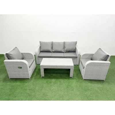 General description This deluxe 4 piece rattan sofa set is a great addition to your patio or garden, made of high-quality PE rattan and durable galvanized steel. The set includes two reclining chairs, a three-seater sofa, and a rectangular coffee table, all designed for comfort and style. Technical specifications 2 x Reclining chairs Size: 74W x 69D x 79H cm 1 x 3 Seater Sofa Size: 177W x 67D x 79H cm 1 x Table Size: 105L x 50W x 48H cm Sofa Weight Capacity: 250kg Table Weight Capacity: 80kg Color: Light grey rattan with dark grey fabric Seat Cushion Thickness: 8 cm Glass Thickness: 5 mm (Tempered Glass) Installation Items come flat packed and are easy to assemble. Usage The armchairs are adjustable, allowing you to change the inclination of the chair back from 90° to 130°. Low maintenance with removable cushion covers. Recommended to keep cushions indoors or use a rain cover when not in use. Other information Factory direct sale guarantees quality and after-sale service. If there is