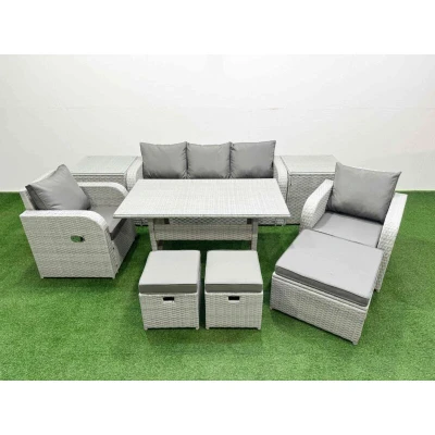 General description This deluxe PE rattan sofa set is an excellent addition to your patio or garden, crafted from high-quality PE rattan and durable galvanized steel. The set includes reclining chairs, a three-seater sofa, a dining table, side tables, and stools, providing both comfort and style for outdoor gatherings. Technical specifications Reclining chairs: 74W x 69D x 79H cm 3 Seater Sofa: 177W x 67D x 79H cm Big footstool: 65L x 65W x 34H cm Fully Assembled Stools: 40W x 40D x 34H cm (2 units) Side tables: 65L x 65W x 66H cm (2 units) Dining Table: 140L x 80W x 68H cm Sofa Weight Capacity: 250kg Table Weight Capacity: 80kg Color: Light grey rattan with dark grey fabric Installation Items come flat packed and are easy to assemble. Usage Adjustable armchairs with a reclining backrest that can be set from 90° to 130°. Low maintenance with removable cushion covers. Recommended to keep cushions indoors or use a rain cover when not in use. Other information 5mm thick transparent