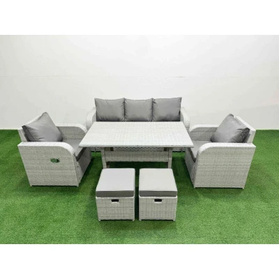 General description This deluxe PE rattan sofa set is a great addition to your patio or garden, made of high-quality PE rattan and durable galvanized steel. The set includes reclining chairs, a three-seater sofa, a dining table, and two stools, providing both comfort and style for outdoor gatherings. Technical specifications 2 x Reclining chairs Size: 74W x 69D x 79H cm 1 x 3 Seater Sofa Size: 177W x 67D x 79H cm 2 x Fully Assembled Stools Size: 40W x 40D x 34H cm 1 x Dining Table Size: 140L x 80W x 68H cm Sofa Weight Capacity: 250kg Table Weight Capacity: 80kg Color: Light grey rattan with dark grey fabric Installation Items come flat packed and are easy to assemble. Sturdy galvanized steel tube metal frames with powder coating to prevent rust. Usage The 2 armchairs are adjustable, allowing you to change the inclination of the chair back from 90° to 130°. Low maintenance with removable cushion covers. Keep cushions indoors or use a rain cover when not in use. Cover the furniture with