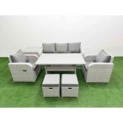 General description This deluxe PE rattan sofa set is a great addition to your patio or garden, made of high-quality PE rattan and durable galvanized steel. The set includes reclining chairs, a three-seater sofa, stools, and tables, providing a comfortable and stylish outdoor seating solution. Technical specifications 2 x Reclining chairs Size: 74W x 69D x 79H cm 1 x 3 Seater Sofa Size: 177W x 67D x 79H cm 2 x Fully Assembled Stools Size: 40W x 40D x 34H cm 1 x Side table Size: 65L x 65W x 66H cm 1 x Dining Table Size: 140L x 80W x 68H cm Sofa Weight Capacity: 250kg Table Weight Capacity: 80kg Color: Light grey rattan with dark grey fabric Installation Items come flat packed and are easy to assemble. Usage The 2 armchairs are adjustable, allowing you to change the inclination of the chair back from 90° to 130°. Low maintenance with removable cushion covers. Keep cushions indoors or use a rain cover when not in use. Use a rain cover for the furniture if not in use for an extended