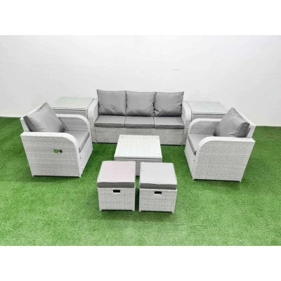 General description This deluxe PE rattan sofa set is an excellent addition to any patio or garden, crafted from high-quality PE rattan and durable galvanized steel. The set includes two reclining chairs, a three-seater sofa, two side tables, and two small stools, all designed for comfort and style. Technical specifications 2 x Reclining chairs Size: 74W x 69D x 79H cm 1 x 3 Seater Sofa Size: 177W x 67D x 79H cm 2 x Fully Assembled Stools Size: 40W x 40D x 34H cm 2 x Side tables Size: 65L x 65W x 66H cm 1 x Coffee Table Size: 65L x 65W x 34H cm Sofa Weight Capacity: 250kg Table Weight Capacity: 80kg Color: Light grey rattan with dark grey fabric Installation Items come flat packed and are easy to assemble. Usage The armchairs are adjustable, allowing you to change the inclination of the chair back from 90° to 130°. Low maintenance with removable cushion covers. Recommended to keep cushions indoors or use a rain cover when not in use. Other information 5mm thick transparent tempered