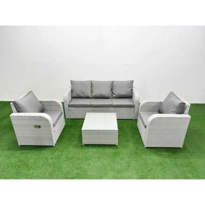General description This deluxe 4 piece rattan sofa set is a great addition to your patio or garden, made of high-quality PE rattan and durable galvanized steel. The set includes two reclining chairs, a three-seater sofa, and a square coffee table, all designed for comfort and style. Technical specifications 2 x Reclining chairs Size: 74W x 69D x 79H cm 1 x 3 Seater Sofa Size: 177W x 67D x 79H cm 1 x Table Size: 65L x 65W x 34H cm Sofa Weight Capacity: 250kg Table Weight Capacity: 80kg Color: Light grey rattan with dark grey fabric Seat Cushion Thickness: 8 cm Glass Thickness: 5 mm (Tempered Glass) Installation Items come flat packed and are easy to assemble. Sturdy galvanized steel tube metal frames with powder coating to prevent rust. Usage The two armchairs are adjustable, allowing you to change the inclination of the chair back from 90° to 130°. Low maintenance with removable cushion covers. Recommended to keep cushions indoors or use a rain cover when not in use. Other