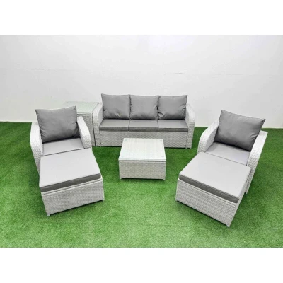 General description This deluxe PE rattan sofa set is an excellent addition to your patio or garden, crafted from high-quality PE rattan and durable galvanized steel. The set includes reclining chairs, a three-seater sofa, footstools, and tables, providing both comfort and style for outdoor relaxation. Technical specifications Set dimensions: 2 x Reclining chairs: 74W x 69D x 79H cm 1 x 3 Seater Sofa: 177W x 67D x 79H cm 2 x Big footstools: 65L x 65W x 34H cm 1 x Side table: 65L x 65W x 66H cm 1 x Coffee table: 65L x 65W x 34H cm Sofa weight capacity: 250kg Table weight capacity: 80kg Color: Light grey rattan with dark grey fabric Installation Items come flat packed and are easy to assemble. Includes sturdy galvanized steel tube metal frames with powder coating to prevent rust. Usage The two armchairs are adjustable, allowing you to change the backrest inclination from 90° to 130°. Features ergonomic high back and reclining design for extra comfort. Low maintenance with removable