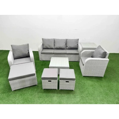 General description This deluxe PE rattan sofa set is a great addition to your patio or garden, made of high-quality PE rattan and durable galvanized steel. The set includes reclining chairs, a three-seater sofa, stools, and tables, providing a comfortable and stylish outdoor seating solution. Technical specifications Set dimensions: 2 x Reclining chairs: 74W x 69D x 79H cm 1 x 3 Seater Sofa: 177W x 67D x 79H cm 1 x Big footstool: 65L x 65W x 34H cm 2 x Fully Assembled Stools: 40W x 40D x 34H cm 1 x Side table: 65L x 65W x 66H cm 1 x Table: 65L x 65W x 34H cm Sofa weight capacity: 250kg Table weight capacity: 80kg Color: Light grey rattan with dark grey fabric Installation Items come flat packed and are easy to assemble. Usage The 2 armchairs are adjustable, allowing you to change the inclination of the chair back from 90° to 130°. Low maintenance with removable cushion covers. Keep cushions indoors or use a rain cover when not in use. Use a rain cover for the furniture if not in use
