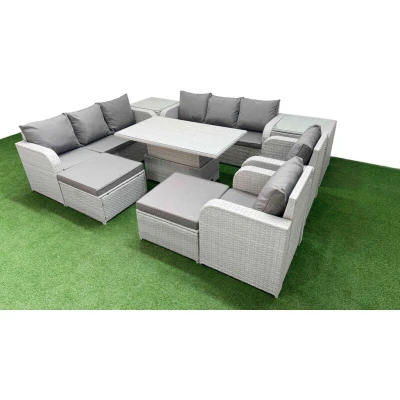 General description This deluxe PE rattan sofa set is a great addition to your patio or garden, made of high-quality PE rattan and durable galvanized steel. The set includes a 3-seater sofa, reclining chairs, footstools, and side tables, providing both comfort and style for outdoor gatherings. Technical specifications 2 x Reclining chairs Size: 74W x 69D x 79H cm 2 x 3 Seater Sofa Size: 177W x 67D x 79H cm 2 x Big footstool Size: 65L x 65W x 34H cm 2 x Side table Size: 65L x 65W x 66H cm 1 x Lifting Table Size: 140L x 80W x 68/48H cm (height adjustable from 68 cm to 48 cm) Sofa Weight Capacity: 250 kg Table Weight Capacity: 80 kg Color: Light grey rattan with dark grey fabric Installation Items come flat packed and are easy to assemble. The set features sturdy galvanized steel tube metal frames with powder coating to prevent rust. Usage The 2 armchairs are adjustable, allowing you to change the inclination of the chair back from 90° to 130° using a button. The set is designed for low