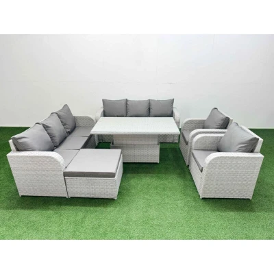 General description This deluxe PE rattan sofa set is a great addition to your patio or garden, made of high-quality PE rattan and durable galvanized steel. The set includes two reclining chairs, a three-seater sofa, a big footstool, and a lifting table, all designed for comfort and style. Technical specifications 2 x Reclining chairs Size: 74W x 69D x 79H cm 2 x 3 Seater Sofa Size: 177W x 67D x 79H cm 1 x Big footstool Size: 65L x 65W x 34H cm 1 x Lifting Table Size: 140L x 80W x 68/48H cm (height adjustable from 68 cm to 48 cm) Sofa Weight Capacity: 250 kg Table Weight Capacity: 80 kg Color: Light grey rattan with dark grey fabric Installation Items come flat packed and are easy to assemble. Sturdy galvanized steel tube metal frames with powder coating to prevent rust. Usage The two armchairs are adjustable, allowing you to change the inclination of the chair back from 90° to 130° using a button. Low maintenance with removable cushion covers. Recommended to keep cushions indoors or