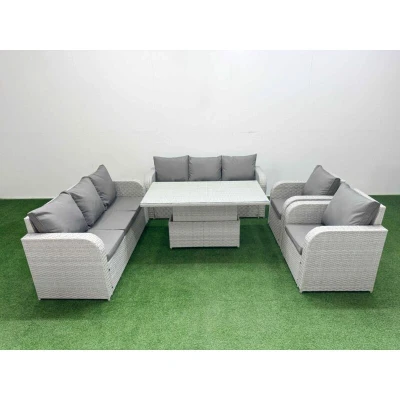 Pe Rattan High Back Lounge Sofa Set Patio Adjustable Lifting Dining or Coffee Table & Chairs with 3 Seater Reclining Chair Light Grey