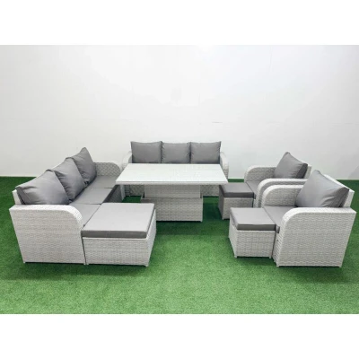 General description This deluxe PE rattan sofa set is a great addition to your patio or garden, made of high-quality PE rattan and durable galvanized steel. The set includes adjustable reclining chairs, a spacious 3-seater sofa, stools, and a lifting table, all designed for comfort and style. Technical specifications 2 x Reclining chairs Size: 74W x 69D x 79H cm 2 x 3 Seater Sofa Size: 177W x 67D x 79H cm 1 x Big footstool: 65L x 65W x 34H cm 2 x Fully Assembled Stools: 40W x 40D x 34H cm 1 x Lifting Table Size: 140L x 80W x 68/48H cm (height adjustable from 68 cm to 48 cm) Sofa Weight Capacity: 250 kg Table Weight Capacity: 80 kg Color: Light grey rattan with dark grey fabric Installation Items come flat packed and are easy to assemble. The set features sturdy galvanized steel tube metal frames with powder coating to prevent rust. Usage The 2 armchairs are adjustable, allowing you to change the inclination of the chair back from 90° to 130° using a button. The set is designed for low