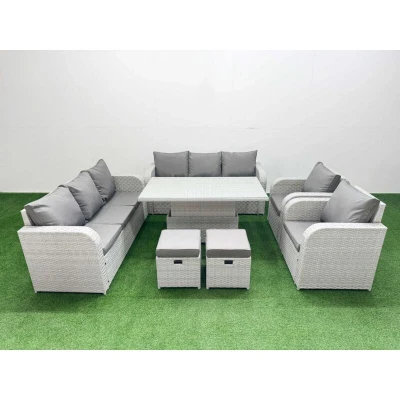Pe Rattan High Back Lounge Sofa Set Patio Adjustable Lifting Dining or Coffee Table & Chairs with 3 Seater Reclining Chair Stools Light Grey