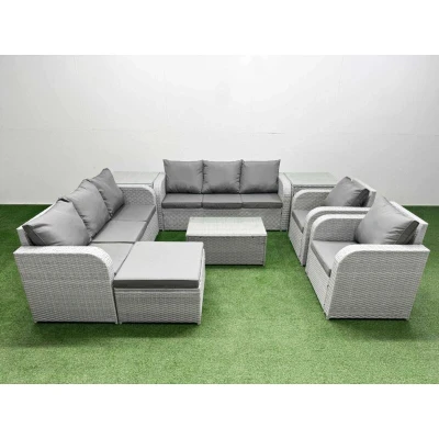 Pe Rattan High Back Lounge Sofa Set Patio Coffee Table & Chairs with 3 Seater Reclining Chair Big Footstool 2 Side Light Grey Fimous