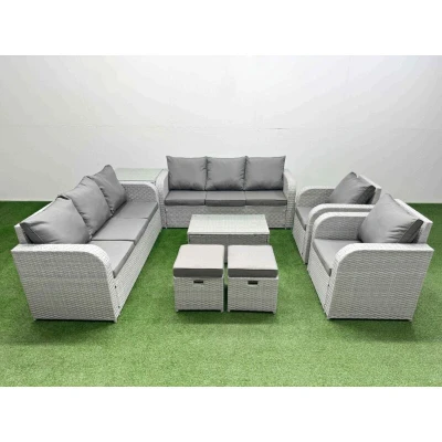 Pe Rattan High Back Lounge Sofa Set Patio Coffee Table & Chairs with 3 Seater Reclining Chair Stools Side Light Grey Fimous