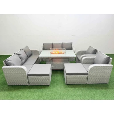 General description This Fimous PE Rattan High Back Lounge Sofa Set is perfect for outdoor relaxation and dining. It includes a 3-seater sofa, two reclining chairs, two big footstools, and a firepit dining table, all designed for comfort and style. The light grey rattan paired with dark grey fabric adds a modern touch to your patio or garden. Technical specifications 2 x Reclining chairs Size: 74W x 69D x 79H cm 2 x 3 Seater Sofa Size: 177W x 67D x 79H cm 2 x Big footstool Size: 65L x 65W x 34H cm 1 x Firepit Dining Table Size: 140L x 80W x 69H cm Sofa Weight Capacity: 250kg Table Weight Capacity: 80kg Material: Light grey rattan with dark grey fabric 5mm Thick Transparent Tempered Glass 8 CM Thick Seat Cushion with Soft Back Cushion Installation Items come flat packed and are easy to assemble. The set features sturdy galvanized steel tube metal frames with powder coating to prevent rust. Usage For optimal use of the fire pit, place it on the glass top and avoid covering the igniter