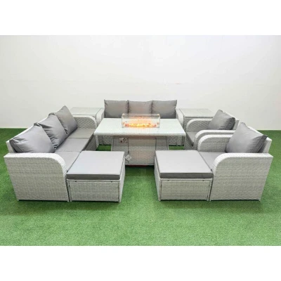 General description This Fimous PE Rattan High Back Lounge Sofa Set is designed for outdoor comfort and style. It includes a 3-seater sofa, two reclining chairs, two big footstools, and two side tables, all complemented by a firepit dining table. The set features a light grey rattan finish with dark grey fabric cushions, providing a modern aesthetic for your patio or garden. Technical specifications Set dimensions: 2 x Reclining chairs: 74W x 69D x 79H cm 2 x 3 Seater Sofa: 177W x 67D x 79H cm 2 x Big footstool: 65L x 65W x 34H cm 2 x Side table: 65L x 65W x 66H cm 1 x Firepit Dining Table: 140L x 80W x 69H cm Sofa weight capacity: 250 kg Table weight capacity: 80 kg Material: Light grey PE rattan with dark grey fabric cushions 5 mm thick transparent tempered glass on the firepit table 8 cm thick seat cushion with soft back cushion Installation Items come flat packed and are easy to assemble. Sturdy galvanized steel tube metal frames with powder coating to prevent rust. Usage