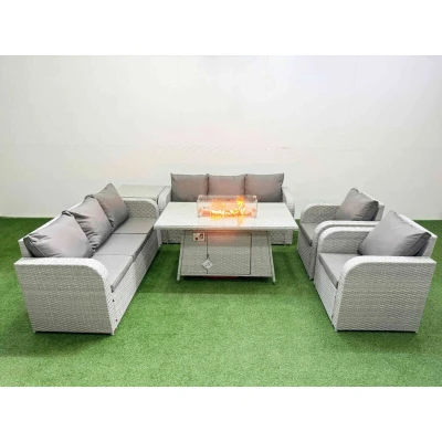 General description This Fimous PE Rattan High Back Lounge Sofa Set is perfect for outdoor relaxation and dining. It includes a 3-seater sofa, two reclining chairs, a side table, and a firepit dining table, all designed with comfort and style in mind. The light grey rattan paired with dark grey fabric offers a modern aesthetic, while the adjustable reclining chairs provide customizable comfort. Technical specifications Set dimensions: 2 x Reclining chairs: 74W x 69D x 79H cm 2 x 3 Seater Sofa: 177W x 67D x 79H cm 1 x Side table: 65L x 65W x 66H cm 1 x Firepit Dining Table: 140L x 80W x 69H cm Sofa weight capacity: 250 kg Table weight capacity: 80 kg Material: Light grey PE rattan with dark grey fabric 5mm thick transparent tempered glass on the firepit table 8 cm thick seat cushion with soft back cushion Installation Items come flat packed and are easy to assemble. The set features sturdy galvanized steel tube metal frames with powder coating to prevent rust. Usage For optimal safety,