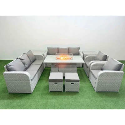 General description This Fimous PE Rattan High Back Lounge Sofa Set is perfect for outdoor relaxation and dining. It includes a 3-seater sofa, reclining chairs, stools, and side tables, all designed with comfort and style in mind. The light grey rattan paired with dark grey fabric creates a modern look for your patio or garden. Technical specifications Set dimensions: 2 x Reclining chairs: 74W x 69D x 79H cm 2 x 3 Seater Sofa: 177W x 67D x 79H cm 2 x Fully Assembled Stools: 40W x 40D x 34H cm 2 x Side tables: 65L x 65W x 66H cm 1 x Firepit Dining Table: 140L x 80W x 69H cm Sofa Weight Capacity: 250kg Table Weight Capacity: 80kg Material: Light grey PE rattan with dark grey fabric 5mm Thick Transparent Tempered Glass 8 cm Thick Seat Cushion with Soft Back Cushion Installation Items come flat packed and are easy to assemble. Sturdy galvanized steel tube metal frames with powder coating to prevent rust. Usage Adjustable armchairs with a reclining feature from 90° to 130°. Low maintenance