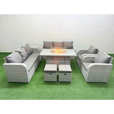 General description This Fimous PE Rattan High Back Lounge Sofa Set is designed for outdoor comfort and style. It includes a 3-seater sofa, reclining chairs, stools, a side table, and a firepit dining table, all crafted from durable materials. The light grey rattan paired with dark grey fabric offers a modern aesthetic, perfect for patios and gardens. Technical specifications 2 x Reclining chairs: 74W x 69D x 79H cm 2 x 3 Seater Sofa: 177W x 67D x 79H cm 2 x Fully Assembled Stools: 40W x 40D x 34H cm 1 x Side table: 65L x 65W x 66H cm 1 x Firepit Dining Table: 140L x 80W x 69H cm Sofa Weight Capacity: 250kg Table Weight Capacity: 80kg Material: Light grey PE rattan with dark grey fabric Seat Cushion Thickness: 8 cm Glass Top Thickness: 5 mm tempered glass Installation Items come flat packed and are easy to assemble. Sturdy galvanized steel tube metal frames with powder coating to prevent rust. Usage Adjustable reclining chairs with an inclination range of 90°-130°. Low maintenance