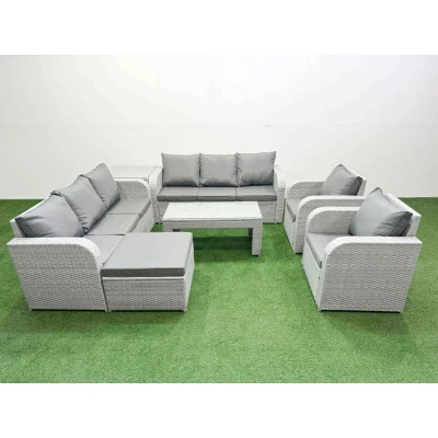 Pe Rattan High Back Lounge Sofa Set Patio Oblong Coffee Table & Chairs with 3 Seater Reclining Chair Big Footstool Side Light Grey