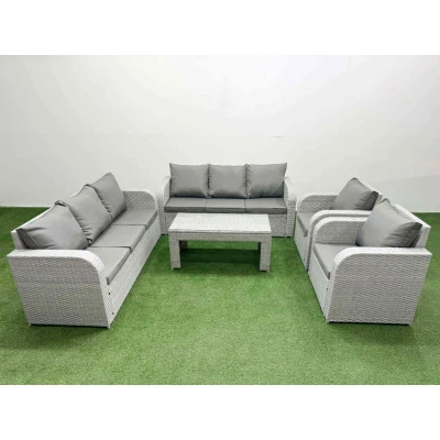 Pe Rattan High Back Lounge Sofa Set Patio Oblong Coffee Table & Chairs with 3 Seater Reclining Chair Light Grey Fimous