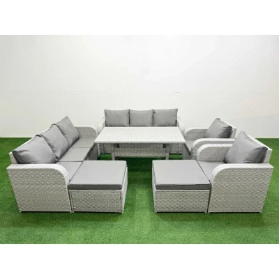 Pe Rattan High Back Lounge Sofa Set Patio Rectangular Dining Table & Chairs with 3 Seater Reclining Chair 2 Big Footstool Light Grey Fimous