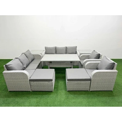 General description This deluxe PE rattan sofa set is a great addition to your patio or garden, made of high-quality PE rattan and durable galvanized steel. The set includes two reclining chairs, a three-seater sofa, two big footstools, two side tables, and a dining table, all designed for comfort and style. Technical specifications 2 x Reclining chairs Size: 74W x 69D x 79H cm 2 x 3 Seater Sofa Size: 177W x 67D x 79H cm 2 x Big footstool Size: 65L x 65W x 34H cm 2 x Side table Size: 65L x 65W x 66H cm 1 x Dining Table Size: 140L x 80W x 68H cm Sofa Weight Capacity: 250kg Table Weight Capacity: 80kg Color: Light grey rattan with dark grey fabric Installation Items come flat packed and are easy to assemble. The set features sturdy galvanized steel tube metal frames with powder coating to prevent rust. Usage The two armchairs are adjustable, allowing you to change the inclination of the chair back from 90° to 130° using a button. The set is designed for low maintenance, with removable