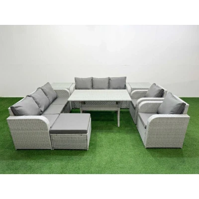General description This deluxe PE rattan sofa set is an excellent addition to your patio or garden, crafted from high-quality PE rattan and durable galvanized steel. The set includes a 3-seater sofa, reclining chairs, a big footstool, side tables, and a dining table, all designed for comfort and style. Technical specifications 2 x Reclining chairs Size: 74W x 69D x 79H cm 2 x 3 Seater Sofa Size: 177W x 67D x 79H cm 1 x Big footstool Size: 65L x 65W x 34H cm 2 x Side table Size: 65L x 65W x 66H cm 1 x Dining Table Size: 140L x 80W x 68H cm Sofa Weight Capacity: 250kg Table Weight Capacity: 80kg Color: Light grey rattan with dark grey fabric Installation Items come flat packed and are easy to assemble. Usage Adjustable reclining chairs with an inclination range from 90° to 130°. Low maintenance with removable cushion covers. Recommended to keep cushions indoors or covered when not in use. Other information 5mm thick transparent tempered glass with suckers on the surface to prevent