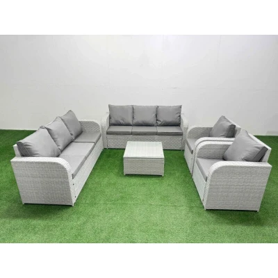 Pe Rattan High Back Lounge Sofa Set Patio Square Coffee Table & Chairs with 3 Seater Reclining Chair Light Grey Fimous