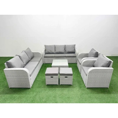 Pe Rattan High Back Lounge Sofa Set Patio Square Coffee Table & Chairs with 3 Seater Reclining Chair Stools Light Grey Fimous