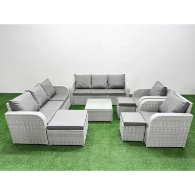 Pe Rattan High Back Lounge Sofa Set Patio Square Coffee Table & Chairs with 3 Seater Reclining Chair Stools Light Grey Fimous