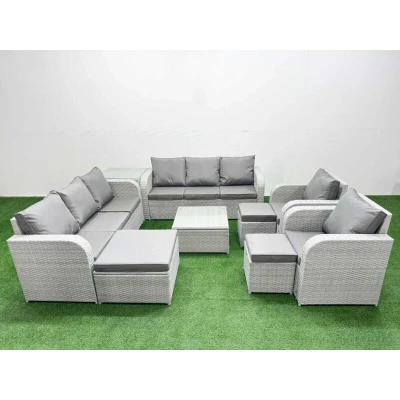 Pe Rattan High Back Lounge Sofa Set Patio Square Coffee Table & Chairs with 3 Seater Reclining Chair Stools Side Light Grey Fimous