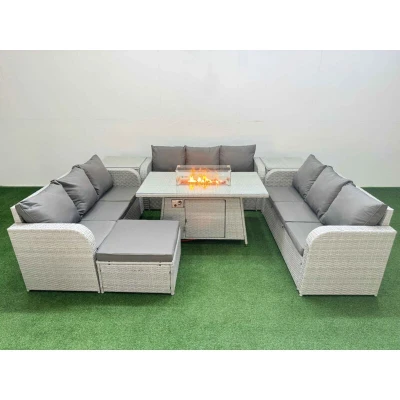 General description This Fimous PE Rattan Lounge Sofa Set is a stylish and functional outdoor furniture solution, accommodating up to 10 people. It features a firepit dining table, a spacious 3-seater sofa, a big footstool, and two side tables, all designed for comfort and durability. The light grey PE rattan is complemented by dark grey fabric cushions, providing a modern aesthetic for your garden or patio. Technical specifications 3 x 3-seater Sofa Size: 177W x 67D x 79H cm 2 x Side Table Size: 65L x 65W x 66H cm Big Footstool Size: 65L x 65W x 34H cm Firepit Dining Table Size: 140L x 80W x 69H cm Seat Cushion Thickness: 8 cm Material: Light grey PE rattan with dark grey fabric cushions Frame: Sturdy galvanized steel tube with powder coating to prevent rust Glass: 5mm thickness transparent tempered glass Installation Items come flat packed and are easy to assemble. Ensure to check the product carefully before signing for delivery. If there are any obvious damages, please mark them