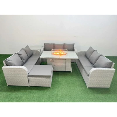 General description This Fimous PE Rattan Lounge Sofa Set is a stylish and comfortable 10-seater outdoor garden furniture set, featuring a firepit dining table, three-seater sofas, a big footstool, and a side table. The set is designed with light grey PE rattan and dark grey fabric, providing a modern look for your outdoor space. Please note that color may vary slightly due to lighting or monitor settings. Technical specifications 3 x 3 Seater Sofa Size: 177W x 67D x 79H cm Side Table Size: 65L x 65W x 66H cm Big Footstool Size: 65L x 65W x 34H cm Firepit Dining Table Size: 140L x 80W x 69H cm 8 cm Thick Seat Cushion with Soft Pillow Back Cushion Material: Light grey PE rattan with dark grey fabric Frame: Sturdy galvanized steel tube with powder coating to prevent rust Glass: 5mm thickness transparent tempered glass with suckers on the surface to prevent sliding Installation Items come flat packed and are easy to assemble. Usage Place the gas fire pit on the glass top of the dining
