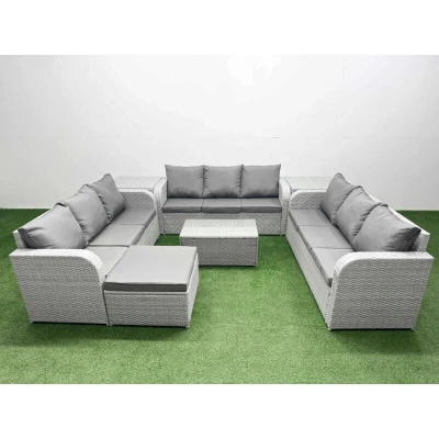 General description This 10-seater deluxe garden furniture set enhances the aesthetic of your courtyard, deck, backyard, porch, or swimming pool. Constructed from high-quality PE rattan and durable galvanized steel, it is designed to withstand adverse weather conditions and can be easily reconfigured to suit your needs. Technical specifications 3 x 3-seater Sofa Size: 177W x 67D x 79H cm 2 x Side Table: 65L x 65W x 66H cm 2 x Fully Assembled Stools: 40W x 40D x 34H cm 1 x Oblong Coffee Table: 85L x 50W x 37H cm Seat Cushion Thickness: 8 cm Material: Light grey PE rattan with dark grey fabric Glass Thickness: 5 mm tempered glass Installation Items come flat packed and are easy to assemble. Sturdy galvanized steel tube frames with powder coating to prevent rust. Usage Low maintenance with removable cushion covers. Keep cushions indoors or use a rain cover when not in use. Use a rain cover for the furniture if not in use for an extended period. Other information Factory direct sale