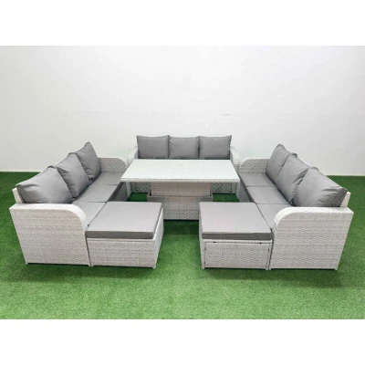 General description This 11-seater deluxe garden furniture set enhances your outdoor space, including courtyards, decks, backyards, porches, and swimming pools. Constructed from high-quality PE rattan and durable galvanized steel, it is designed to withstand adverse weather conditions in the UK. The set can be easily reconfigured to suit your needs. Technical specifications 3 x 3-seater Sofa Size: 177W x 67D x 79H cm 2 x Big Footstools: 65L x 65W x 34H cm 1 x Lifting Table Size: 140L x 80W x 68/48H cm (height adjustable: up to 68 cm, down to 48 cm) Seat Cushion Thickness: 8 cm Installation Items come flat packed and are easy to assemble. Includes sturdy galvanized steel tube metal frames with powder coating to prevent rust. Usage Low maintenance required; removable cushion covers for easy cleaning. Keep cushions indoors or use a rain cover when not in use. Use a rain cover for the furniture if not in use for an extended period. Other information Light grey PE rattan with dark grey