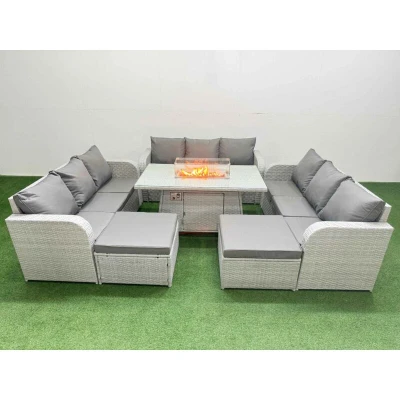 General description This Fimous PE Rattan Lounge Sofa Set is an 11-seater outdoor garden furniture set that includes a firepit dining table, a 3-seater sofa, and 2 big footstools. The set is designed in a light grey color with dark grey fabric, providing a stylish and comfortable seating option for your outdoor space. Technical specifications 3 x 3-seater Sofa Size: 177W x 67D x 79H cm 2 x Big footstool Size: 65L x 65W x 34H cm Firepit Dining Table Size: 140L x 80W x 69H cm Material: Light grey PE rattan with dark grey fabric Thickness of tempered glass: 5mm Seat cushion thickness: 8 cm Installation Items come flat packed and are easy to assemble. Sturdy galvanized steel tube metal frames with powder coating to prevent rust. Usage It is recommended to place the gas fire pit on the glass top, not under it. Check for any gas leakage at the joints or hose before use. Keep the cushions indoors or use a rain cover when not in use. Use a rain cover for the furniture if not used for a long